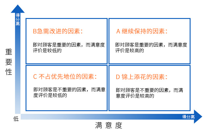 通過顧客對因素重要性的評價和滿意度評價,能夠區分出四種類型的因素,同時對企業或服務進行分析得出: